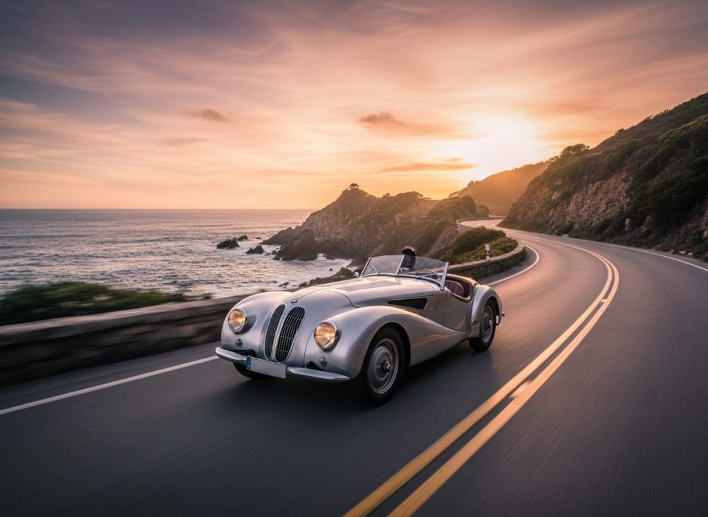 BMW 328 roadster from 30s feels light quick won races Mille Miglia. Engine smooth overhead valves ahead time. Owners love classic lines but parts hard now maybe. Exists vintage fun daily back then. Handling sharp turns heads still. Parked looks good.