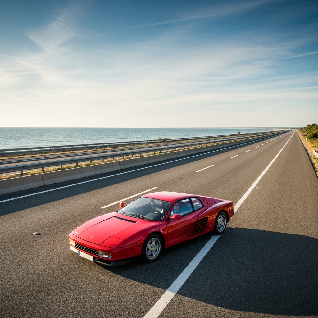 Testarossa Ferrari, wide and flat, exists as a poster car dream, value primed to climb with rarity. Owning means heads turn still, speed feels alive on open roads, or clunky after years. Contradicts a bit with repair costs repeating doubts. Just there iconically.