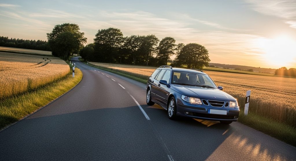 Saab 9-5 wagon quirks with turbo whoosh, unique dash. Existing feels cultish, loyal fans. Experienced as grippy yet odd. Repeats character lightly. Uncertainty about parts now. Sort of fades.