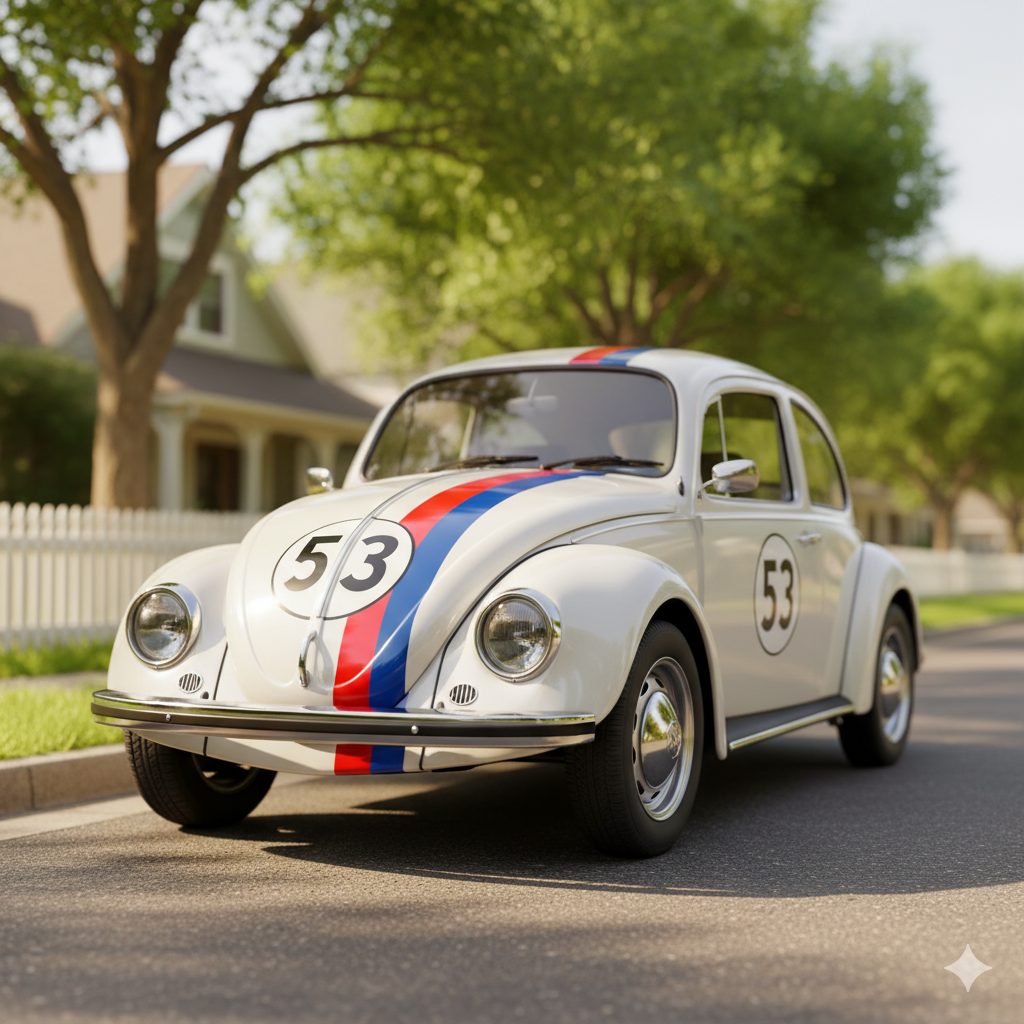 Herbie! The Love Bug! Again, not muscle, but you can’t talk movie cars without him. A sentient, racing, adorable little Beetle with a mind of his own. The number 53 on the hood and the stripes. It’s just wholesome, you know? It made a whole generation see cars as having personalities. A clean, classic Beetle is still one of the most affordable classic cars, you can find a nice one for like $15,000. They’re just happy little cars.