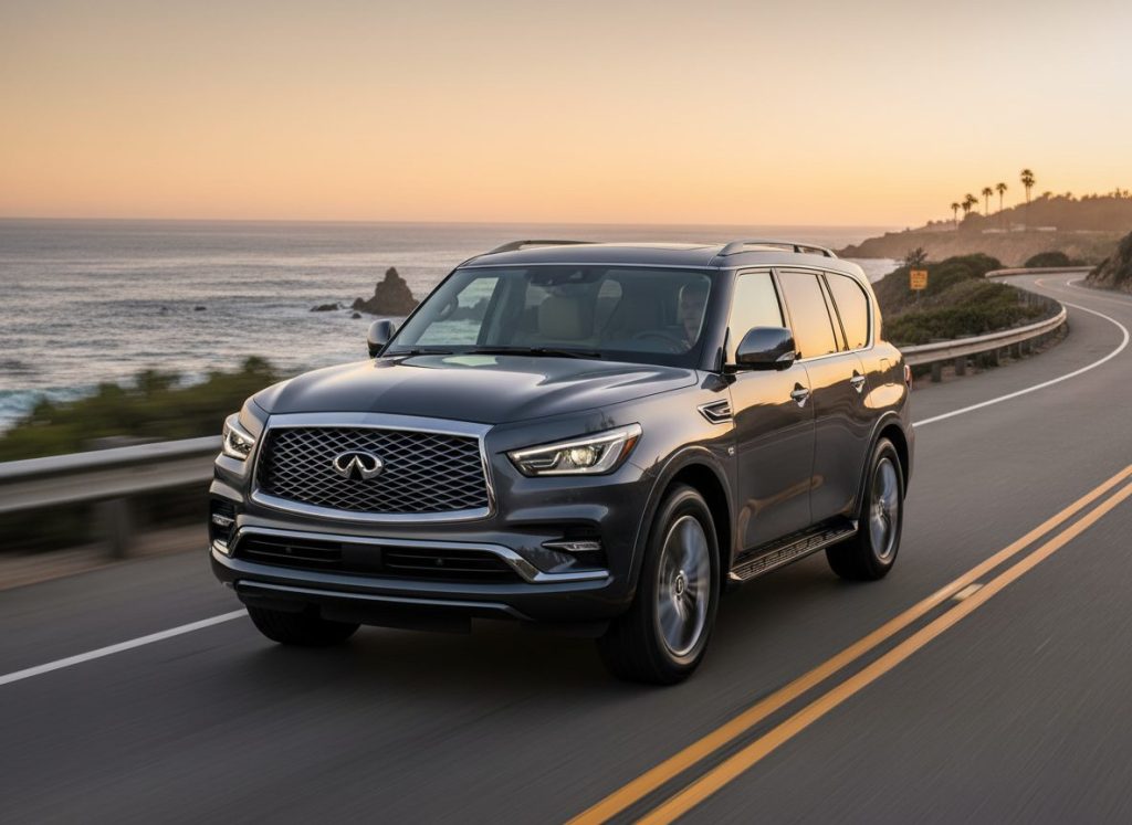 The 2026 Infiniti QX80 Sport sharpens lines with twin-turbo V6 shove feeling quicker than old V8 maybe. Faster pulls and better ride sort of but perfection hides somewhere still. Sport trim darkens it meaner inside screens glow big. Hauls family without total boredom perhaps.
