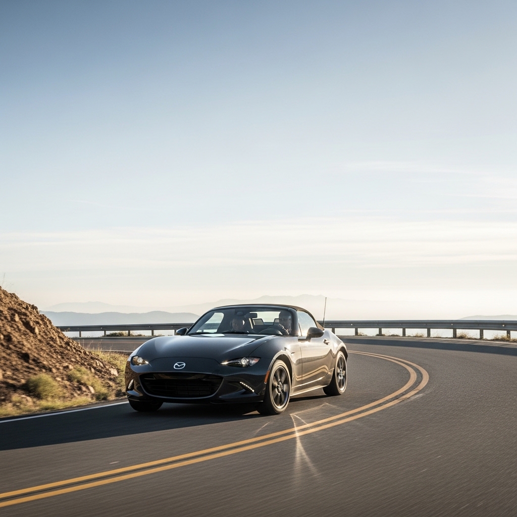 Mazda MX-5 Miata feels light and grin inducing owned top down wind rushing. Repeats simple joy lightly but winter softens it perhaps. Uncertainty manual future contradicting EV push. Owned tiny fun.