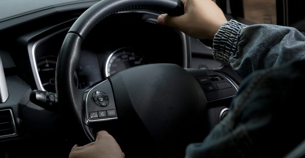 a woman sitting in a car with a steering wheel