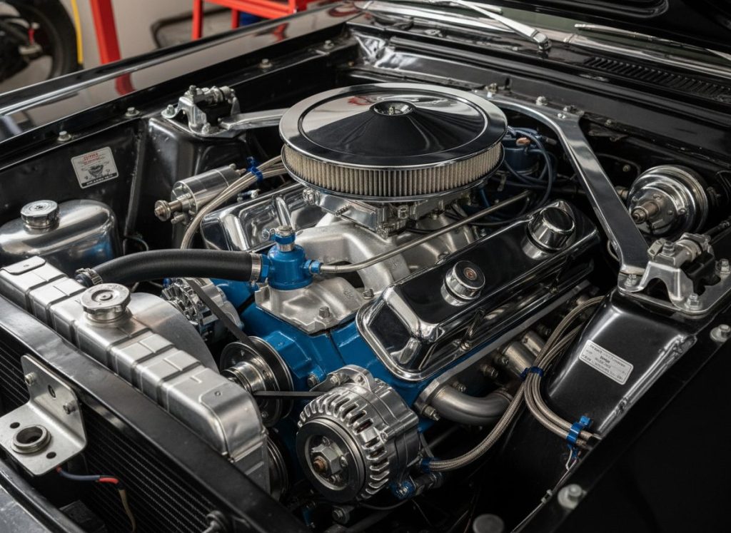 289 V8 bored stroked to 302 stroker power. Heads ported flowed big. Aluminum intake breathed free. Owning means cold starts cough then roar. Sometimes vapor lock teases hot days. Repeats the idle lope charm. Not fully daily tame.
