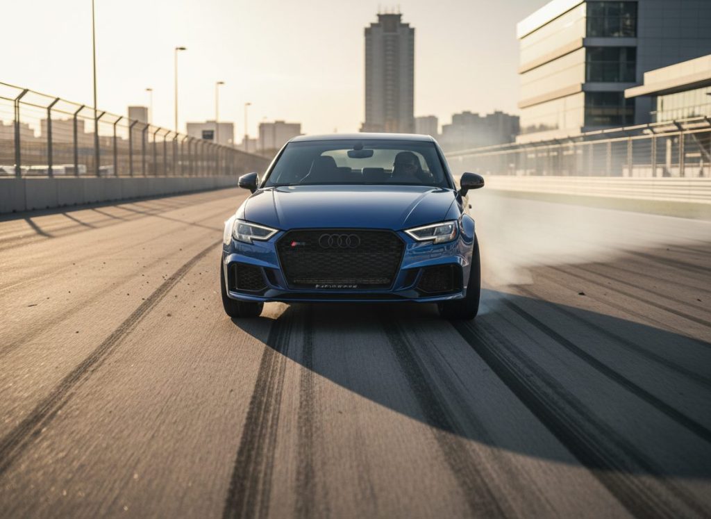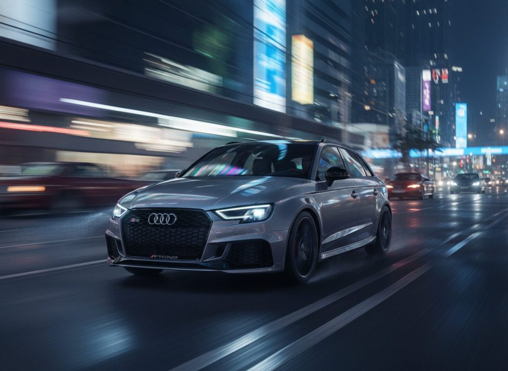 RS3 five cyl 401hp drift mode slides corners. Quattro torque vectors grippy fun. Cabin plush virtual cockpit snappy. Fuel thirsty pops loud track. Owners rack miles no big fails kinda. Quiet cruise loud play.