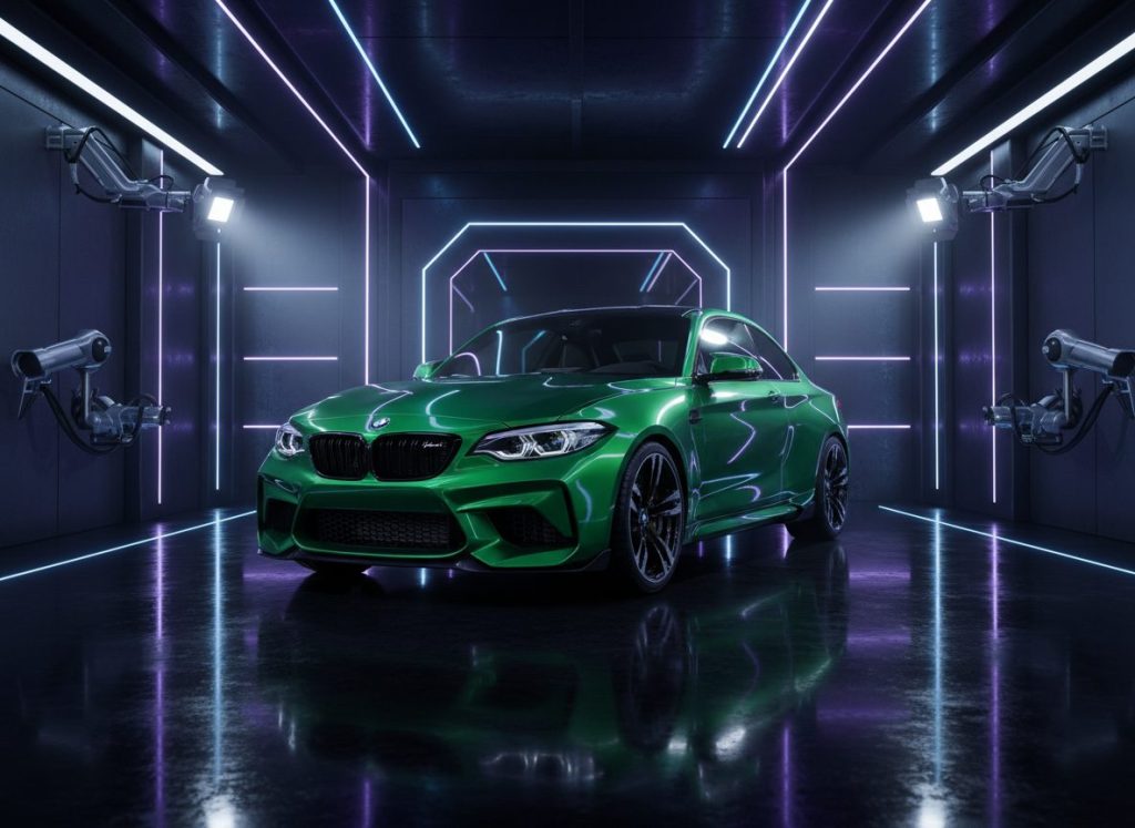 Z in green paint gleams under lights and draws eyes quick. You imagine owning it and twisting roads with it. Grille looks sharper now sort of aggressive. Feels exciting yet maybe too flashy daily. Parked it waits.