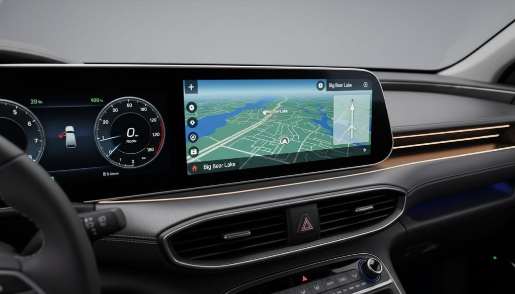 Infotainment screen in 2026 Hyundai Santa Fe Hybrid glows with maps and tunes, responsive or slow at times, feeling connected vaguely. It sits central, repeating tech convenience thoughts. Owned it entertains drives, but glitches soften reliability, uncertainty hanging. Experienced tapping away, not resolving smooth.
