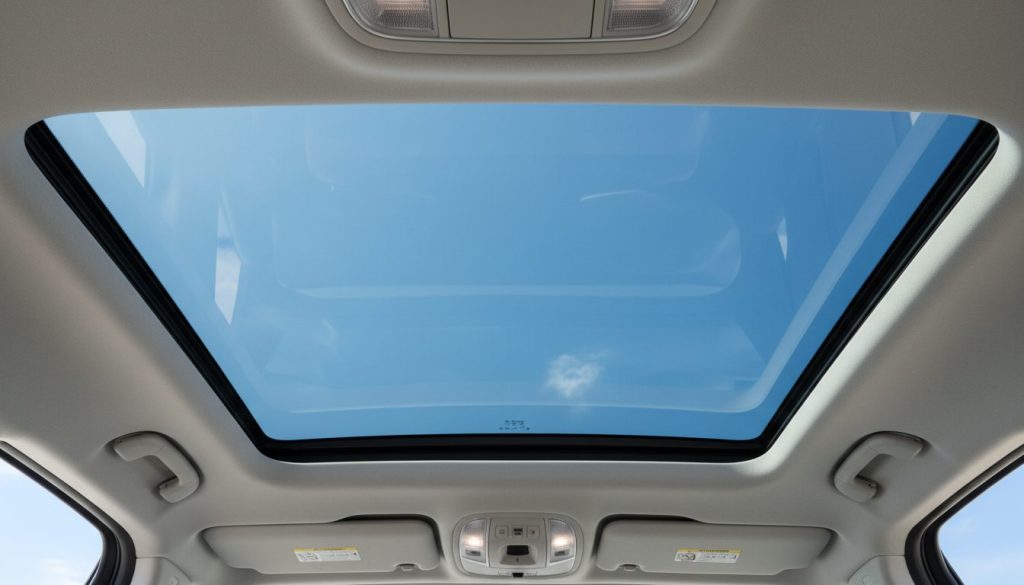 Panoramic roof of 2026 Hyundai Santa Fe Hybrid lets light flood in, sky above feeling expansive or glaring. It opens up the drive, existing overhead, light repeat in moods. Owned it brightens trips, though shade lacks sometimes, softening openness. Uncertainty in weather plays.