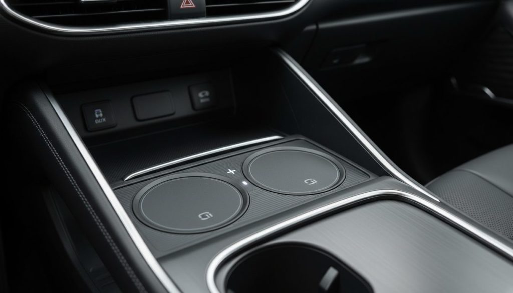 Wireless charging pad 2026 Hyundai Santa Fe Hybrid holds phones buzzing, convenient drop in, feeling modern casually. It exists handy, owned for charged lives repeating. Sometimes it misses connection, contradicting ease, doubt creeps. There’s that spot, weaker somehow.
