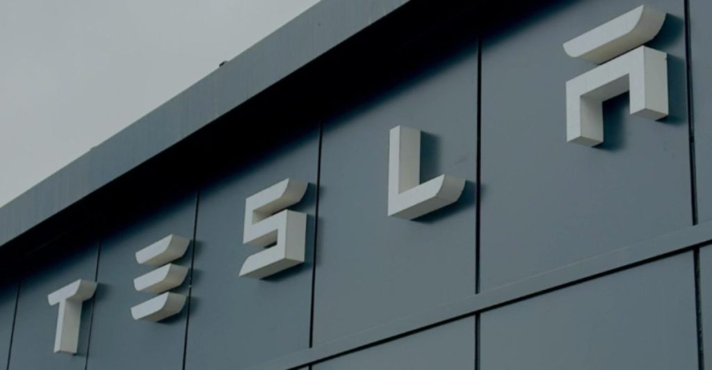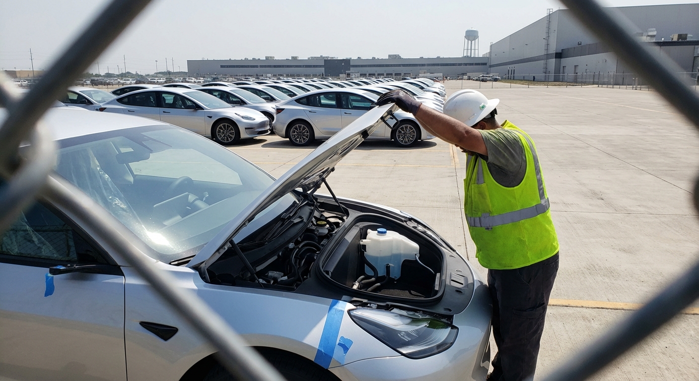 Tesla factory with parked cars during sunset, showcasing modern automotive industry vibes.