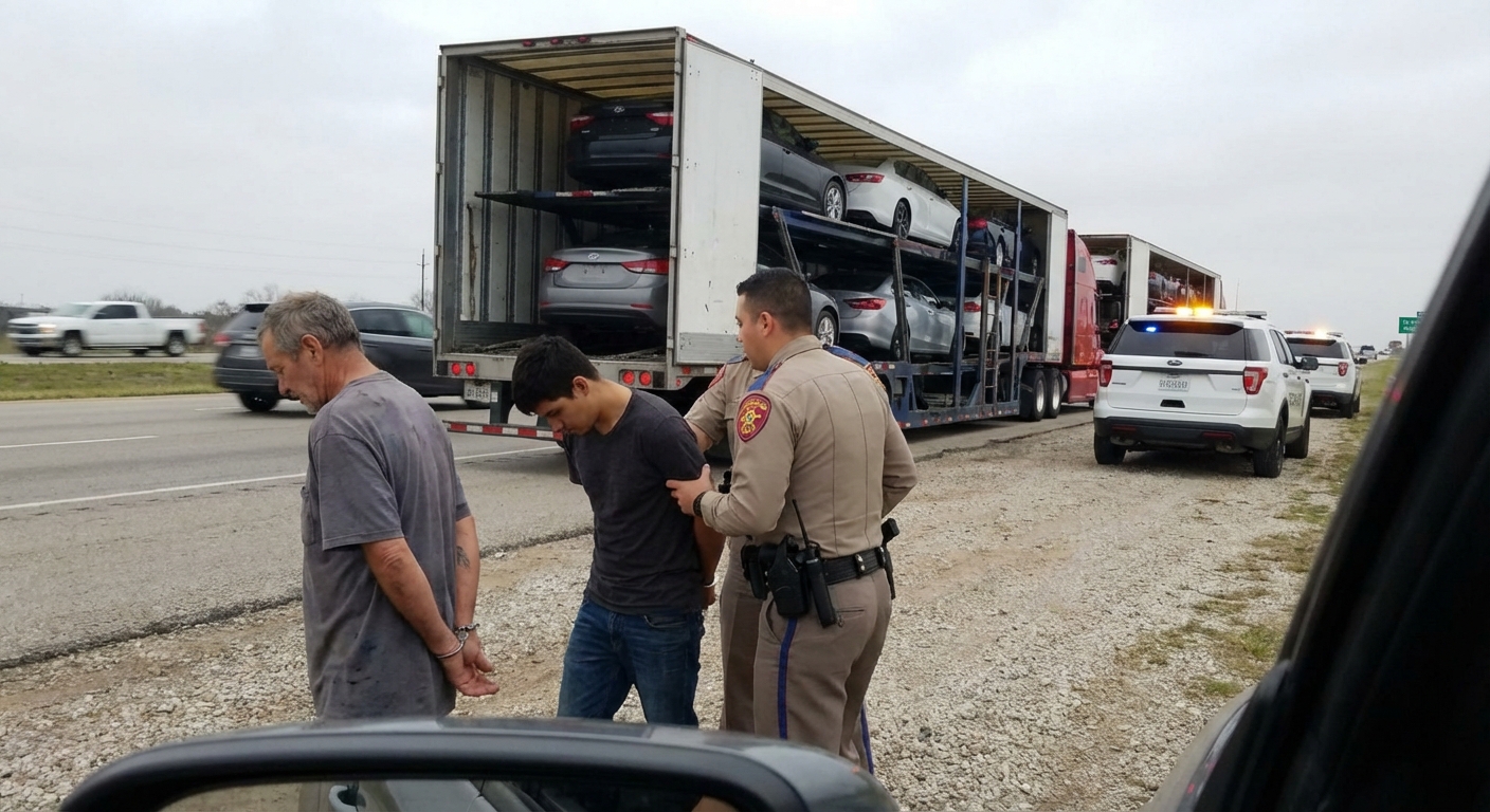 Early morning, April 6, 2026. Two semi-trucks rolling westbound on Interstate 10 through Guadalupe County, Texas, carrying cargo that looked routine from the outside. Inside: six stolen vehicles stacked and strapped, worth more than $470,000, headed for the border, according to investigators.