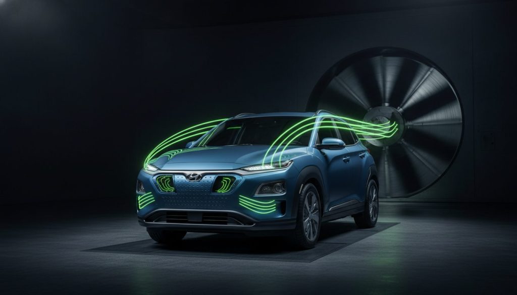Here goes Aerodynamics matter for my Hyundai Kona Electric’s battery life too less wind resistance means I can go farther without recharging See how that swoopy shape helps? It cuts down on energy needed to keep me moving. Then there are active grille shutters, and other tricks like air curtains hiding in plain sight all helping reduce drag so my range stays strong.