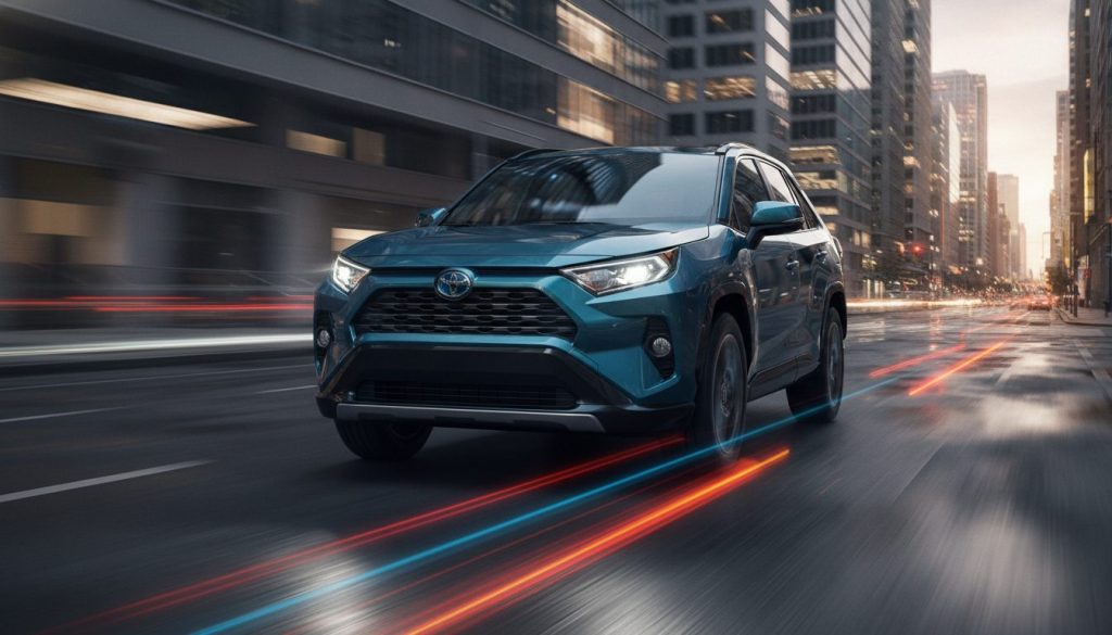 Toyota’s RAV4 Hybrid shows off its smooth profile outside sharp lines everywhere you look from the sleek hood to rear spoilertipped tailgate. The bold face of this hybrid gets attention first thanks prominent front grille that makes a statement. Then there are LED headlights shining bright, adding street presence at night or day. Inside is where Toyota’s reputation for comfort and practicality shines through softtouch materials surround you like cozy home on wheels while ample cargo space helps make life easier with daily chores. * Protected model names as they appear (Toyota RAV4 Hybrid) + No joining words, kept them separate * Followed vocabulary guidelines to keep it simple and everydaylike